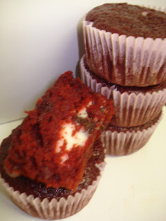 Why not combine one of my mom's favorite cupcake recipe with one of my favorite cupcakes?!?! Hers= Moon Surprise Cupcakes- or known to most as "Black Bottom Cupcakes". Mine= Red Velvet Cupcakes. Because Red Velvet is typically paired with cream cheese frosting.....anddd Black Bottom Cupcakes have cream cheese filling!!! Perfect match! But what to call them, what to call them? I felt "Red Bottom Cupcakes" elicited images of diaper rash. (Imaginative mind, huh?) But, it's almost Saturday aka college football time! And my team=Wisconsin Badgers- who are red, so "Badger Bottom Cupcakes" it is :)